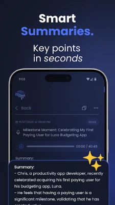 Each transcription includes an AI summary capturing key points. AI automatically detects and extracts to-do lists from voice notes - mention tasks while recording and they're instantly organized. Set Reminders on any note with specific dates/times, ensuring you never miss deadlines. Organize voice notes with custom categories like "Meetings," "Lectures," or "Brainstorms" for quick filtering.